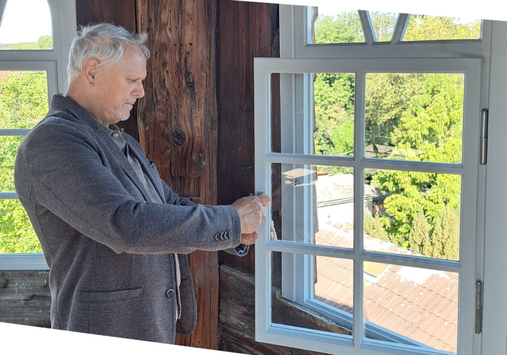 Oktober 2025 🏰 Eigentümer und Projektentwickler Axel Fingerhut hat die neuen Turmfenster inspiziert. Die Arbeiten am Schloss Steinburg schreiten sichtbar voran. Nun sieht man auch von außen schon die ersten Veränderungen. Bisher wurde nur im Inneren vom Schloss gearbeitet.